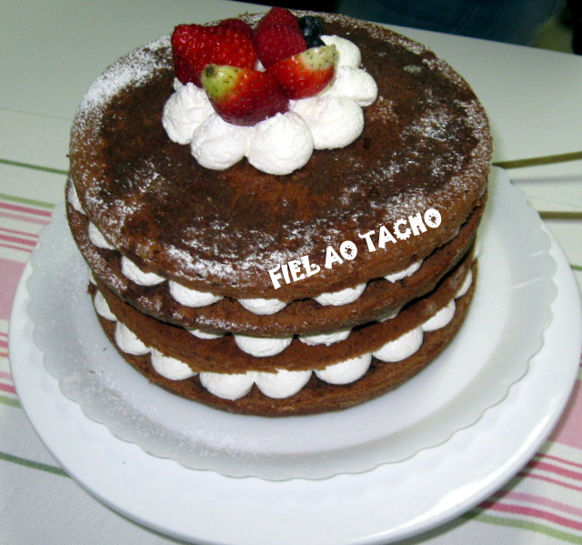 200 g de queijo mascarpone 1/2 lata de leite condensado e natas q. b. bate todos os componentes na batedeira e decora o bolo, utilizando este creme com saco de pasteleiro e frutos a gosto.