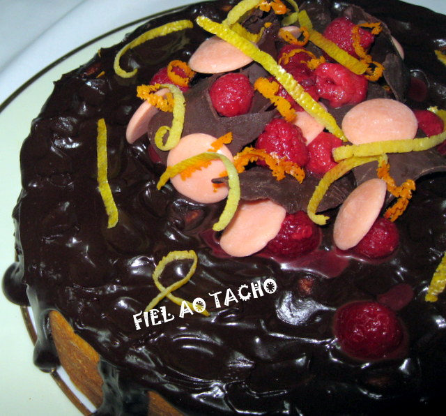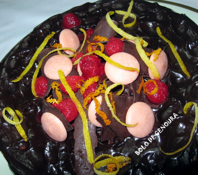 Retire, deixe arrefecer um pouco, desenforme e deixe arrefecer completamente. Prepare a cobertura: Deite, para um tacho, as natas, o cacau e o açúcar, mexa e leve ao lume mexendo sempre até ferver. Deite sobre o bolo, deixe arrefecer e sirva decorado a gosto.