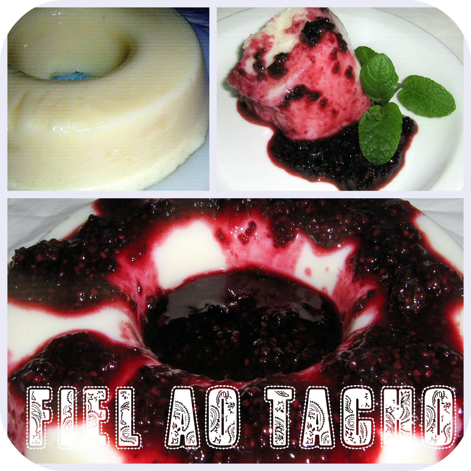 Num tacho juntar todos os ingredientes. Mexer bem até dissolver. Levar a lume brando e ir mexendo sempre até engrossar. Parar quando começar a soltar bolhas e a largar do fundo do tacho. Despeje numa forma de buraco no meio ( previamente untada de óleo) e leve ao frigorífico até ficar frio. Entretanto fazer a calda da fruta (Eu fiz com amoras). Levar todos os ingredientes ao lume até formar uma calda espessa e aveludada. Quem quiser pode triturar com a varinha. Eu prefiro sentir a fruta. Desenformar o doce e colocar a calda por cima. O resultado final é sempre muito bonito!