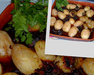 Entretanto, dê uma fervura às batatas (pré-cozidas), inteiras com um corte ao meio e coloque por cima da carne. Polvilhe as batatas com um pouco de colorau e vão ao forno até estarem loirinhas!