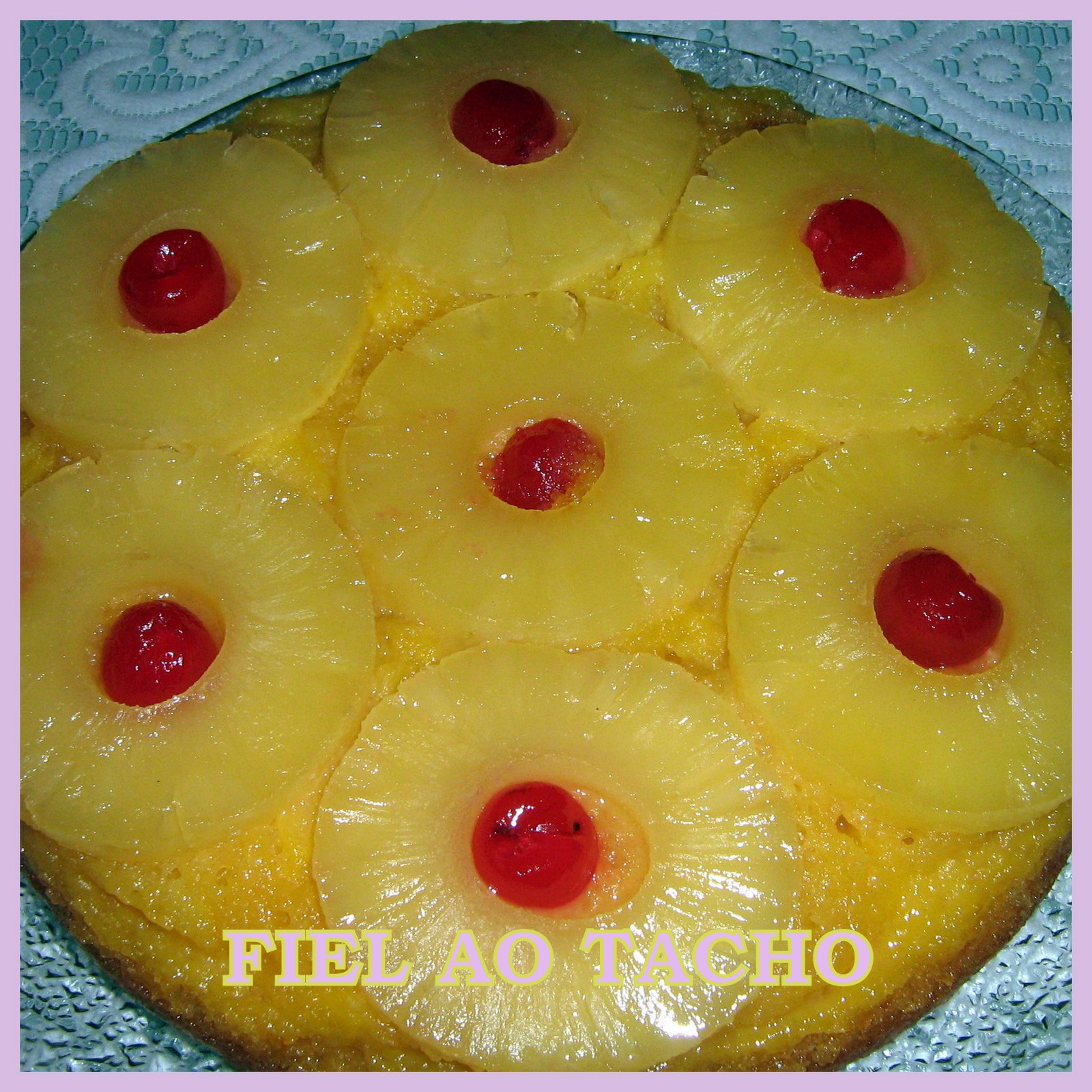 Unta-se uma forma redonda com manteiga e no fundo coloca as 250 g de açúcar espalhado pelo fundo da forma(sem buraco). Por cima do açúcar dispõem-se as rodelas de ananás e no centro de cada rodela coloca uma cereja e rega-se com o sumo da lata de ananás.
