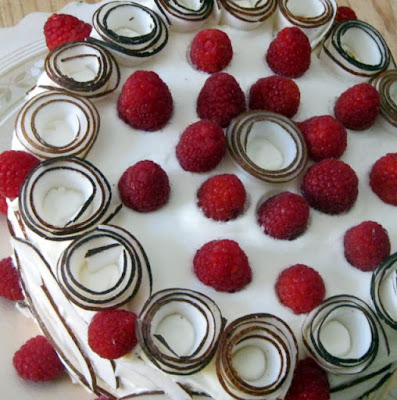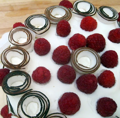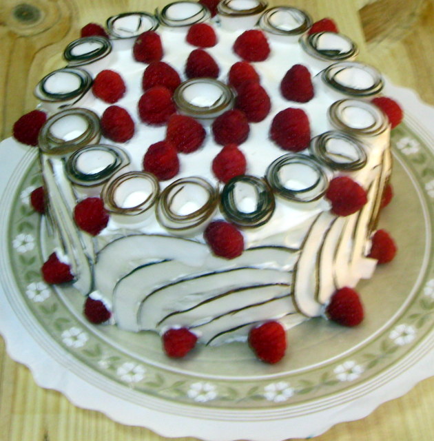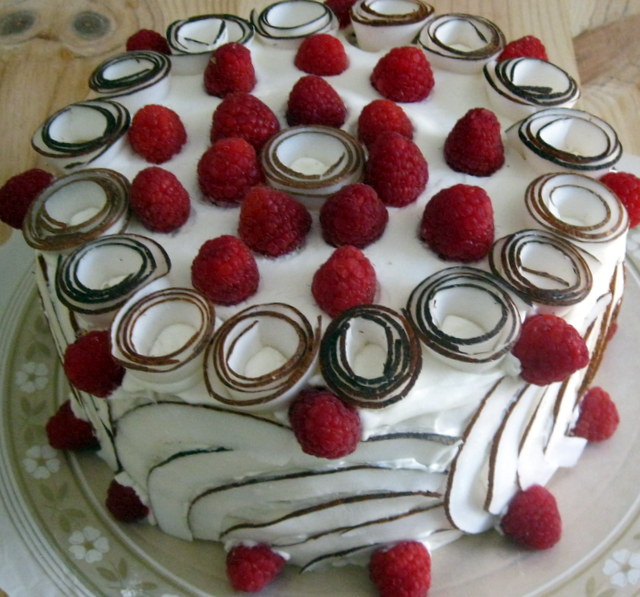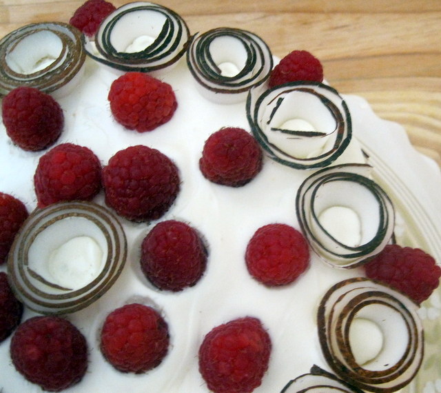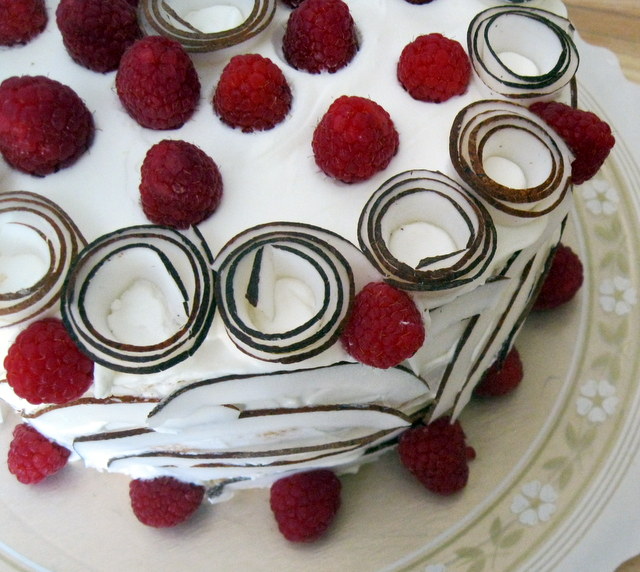 Cobrir o bolo com as restantes natas batidas (topo e laterais). Decorar o bolo como tirinhas de coco.