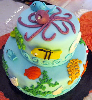 Bate-se tudo, até apresentar uma consistência homogénea. Decorei com pasta de açúcar e motivos do mar visto o rapaz gostar muito de pesca e MAR.