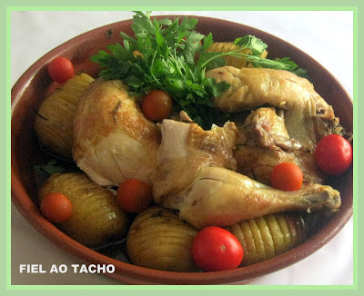 Espetar as batatas de vez em quando e retirar do forno quando estiverem macias, cortar ao meio e reservar. Retirar o frango quando estiver bem dourado e colocar ( sentado) num prato. Ao redor colocar as batatas e os tomates.