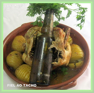 Regar com o caldo do assado e enfiar no gargalo da garrafa o maço de salsa. O truque: durante o assado, a temperatura do forno provoca que a cerveja saia pelo gargalo da garrafa e regue o frango o tempo todo.