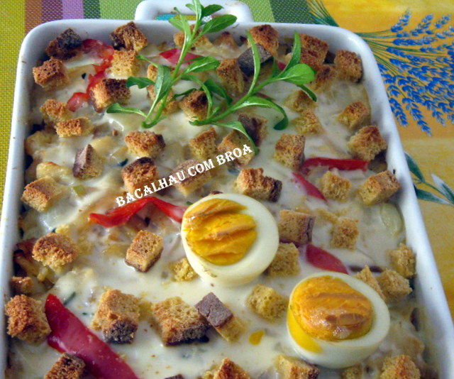 Transfira o preparado anterior para um recipiente refractário de paredes altas em camadas alternadas com os ovos cozidos cortados em rodelas. Regue com o bechamel, polvilhe com as fatias de broa cortada em cubos pequenos e leve ao forno a 190 ºC, durante 20 minutos. Sirva com os restantes poejos.