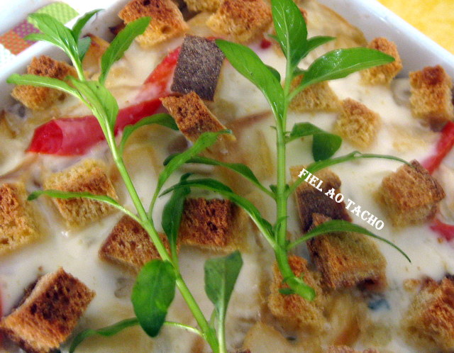 4 . Regue com o molho bechamel e polvilhe com a restante broa esfarelada. Leve ao forno, entre 25 a 30 minutos, a 190º. C, e sirva de seguida decorado a gosto.