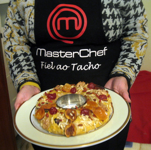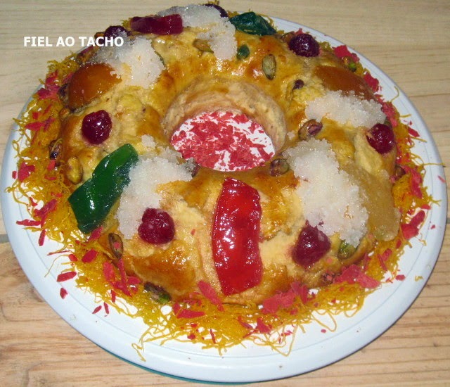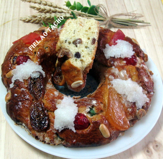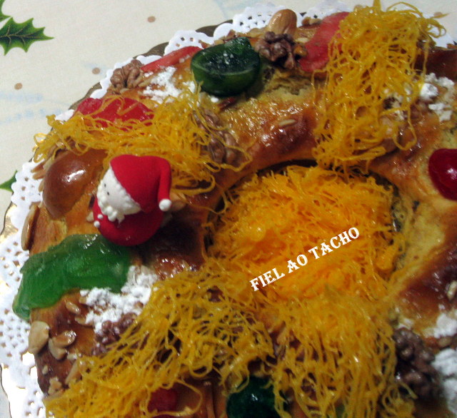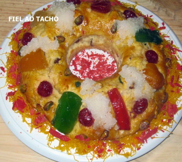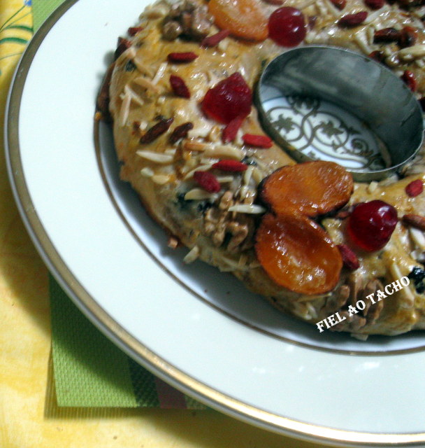 4. De seguida, divida a massa em partes iguais, tenda-as em forma de argolas e disponha-as em formas polvilhadas com farinha. Eu coloquei papel vegetal. Pincele com ovo batido e decore com mais fruta cristalizada. Deixe repousar por mais 15 minutos.