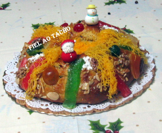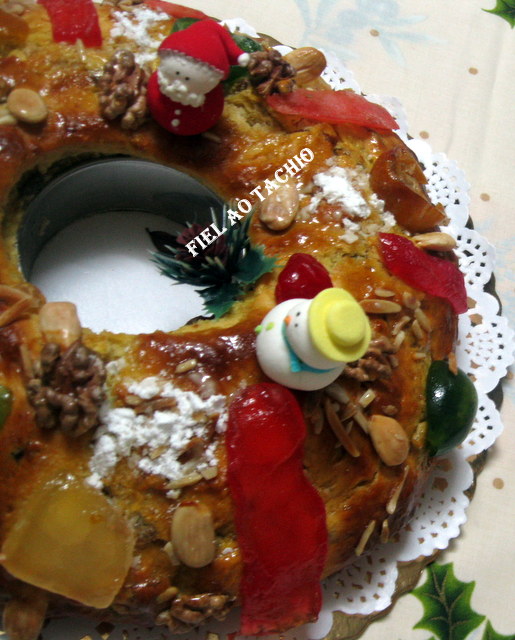 600 g de farinha 150 de margarina 100 g de açúcar 50 g de fruta picada 50 g de miolo de noz picado 50 g de amêndoa 50 g de de passas 50 g de chocolate picado não coloquei 35 g de fermento de padeiro, 4 ovos 100 ml de leite 1 cálice de aguardente velha raspa de 1 limão raspa de uma laranja sal q. b. fruta cristalizada , passas metades de noz e chocolate picado preto q. b. não coloquei açúcar em pó q. b. para polvilhar ovo batido para pincelar