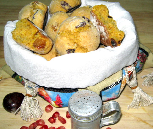 625 g de farinha 0,5k g batata 0,5k g abóbora 250 g açúcar 2 ovos inteiros 1 colher (de chá) de fermento em pó 50 gr manteiga raspa de 1 limão erva doce em pó e canela a gosto 2 colheres de chá de cada) frutos secos picados, a gosto pinhões, nozes, passas, amêndoas, avelãs 150 g na totalidade, mas quanto mais levar melhor