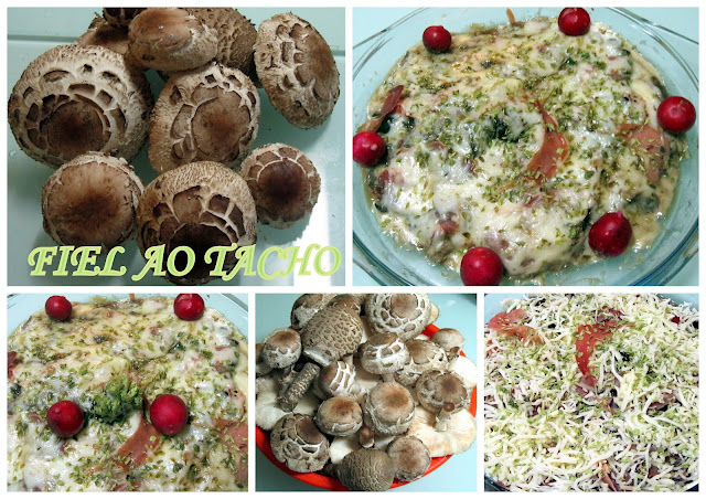 Sobre o cogumelo temperado coloque alguns pedacinhos de bacon e azeitona. Polvilhe com queijo mozzarella ralado (como tinha apenas em fatias cortei em tiras) e polvilhe com oregãos. Leve ao forno a 180ºC durante 15-20 minutos, ou até o cogumelo estar cozinhado e o queijo gratinado. A decoração é a gosto. Receita aqui nesta cozinha que é um mimo obrigada minha querida!