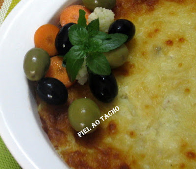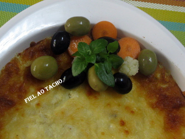 Retire do forno, decore com os pickles reservados, as restantes ervas aromáticas e azeitonas verdes e pretas. Sirva de seguida.