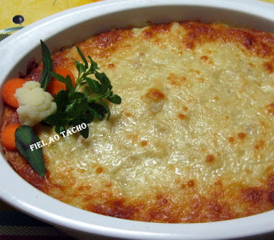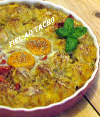 À parte, refogue as cebolas e os alhos em rodelas no azeite e envolva o bacalhau lascado. Pele as batatas, esmague-as com um garfo e envolva-as com o leite a manteiga e as gemas. Tempere com sal pimenta e noz-moscada e incorpore no preparado de bacalhau.