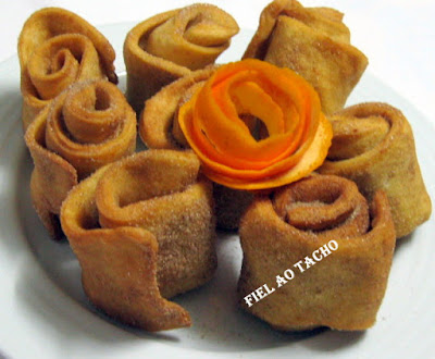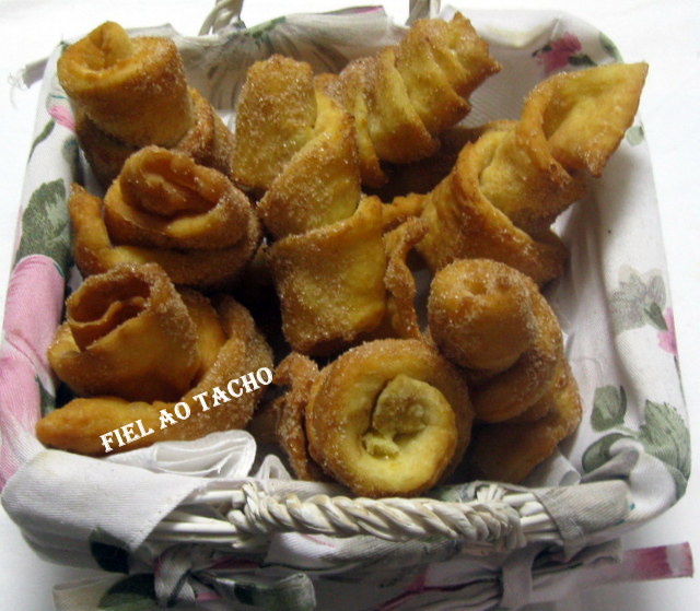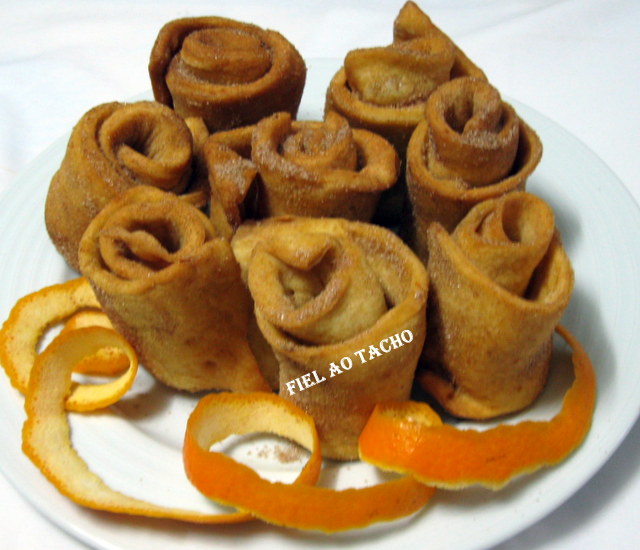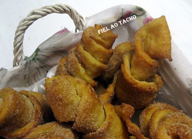 Misture muito bem 500 g de farinha com 2 ovos, 65 g de margarina à temperatura ambiente, a raspa e o sumo de uma laranja e um cálice de aguardente uma pitada de sal açúcar e canela.