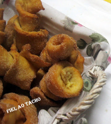 Normalmente estas filhós viram sozinhas, por isso é importante que tenha óleo suficiente e se necessário vai-se acrescentando mais se faltar, mas ás vezes é necessário virá-las. Conforme se vão fritando, retiram-se com uma espumadeira e vão-se colocando no prato com papel de cozinha, depois coloca-se outras a fritar e passam-se as primeiras por açúcar e canela e colocam-se no pirex( claro se houver ajuda de outra pessoa para fazer isso melhor) e vai-se repetindo isso até estarem todas prontas.