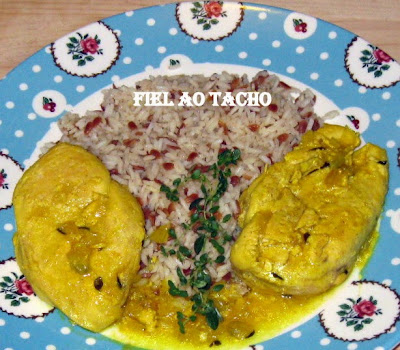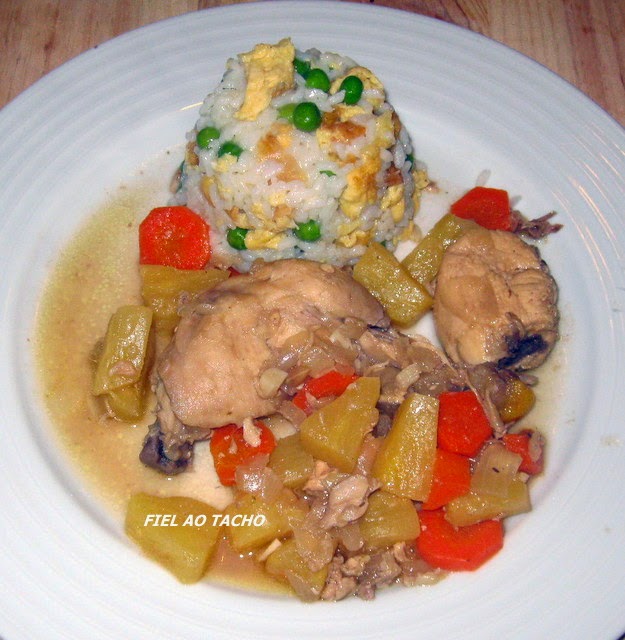 . Num tacho ao lume, aqueça o azeite, junte os pedaços de frango escorridos e deixe-os corar bem de ambos os lados. Adicione depois a a cebola, os alhos, a cenoura, o ananás e o caldo de galinha e deixe cozinhar mais 5 minutos, mexendo de vez em quando.
