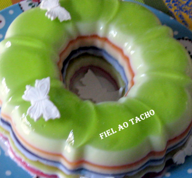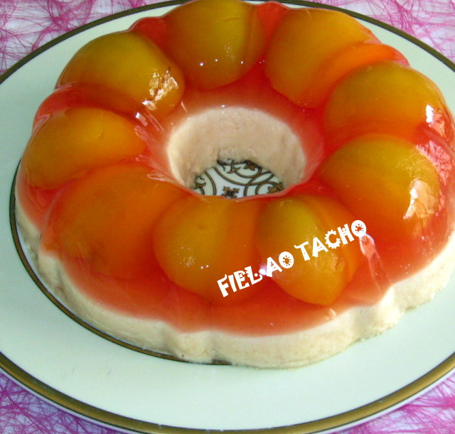 Adicione a mistura de gelatina e envolva bem. Quando a gelatina com os pêssegos estiver solidificada, deite na forma o creme de natas e leite condensado. Leve ao frio cerca de 3 horas eu deixei de um dia para o outro. Para desenformar, passe a forma por água quente. tirei duma de pêssego e fiz com ananás.