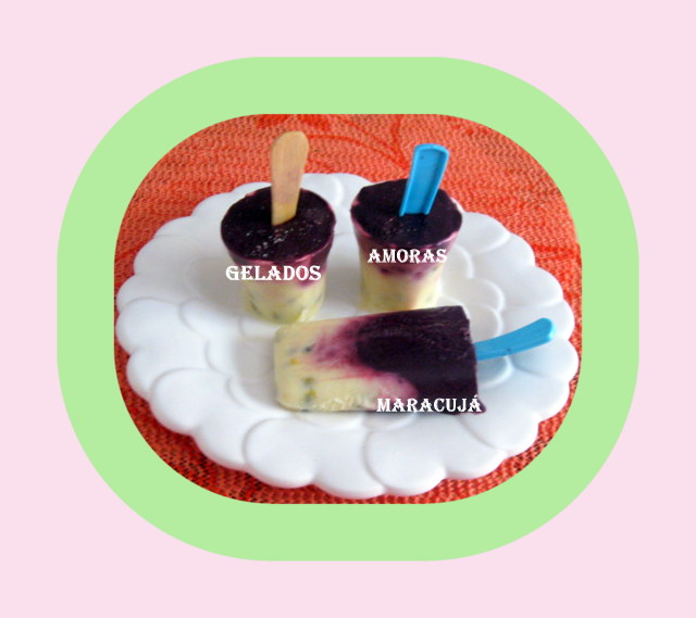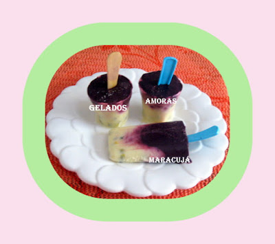Nas forminhas para fazer gelados, encha 1/3 com o iogurte e a restante forma com a mistura de amoras.(Os maracujás são do meu quintal.) No lugar do iogurte fiz com Crème Fraêche