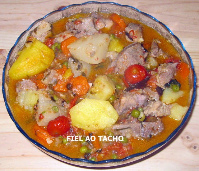 1 cebola picada 4 dentes de alho picados azeite q. b. 3 tomates maduros limpos de peles e sementes 600 g de carne de porco cortada em cubos batatas, cenouras, ervilhas, sal pimenta, pimentão doce, uma  batata doce, um nabo e ramos de hortelã.