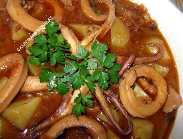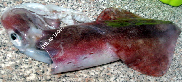 Separar as cabeças das lulas e arranjar tudo. Reservar as lulas e picar as cabeças e os tentáculos. Aquecer metade do azeite e refogar uma das cebolas com as cabeças e tentáculos das lulas durante dez minutos mais ou menos.