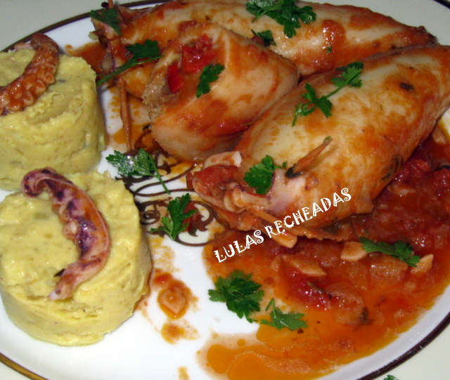 Juntar as lulas temperar com com sal e pimenta cobrir com um pouco de água e baixar o lume, vai virando as lulas de vez em quando. No final polvilhar com mais salsa picada. Acompanhar com puré de batata.