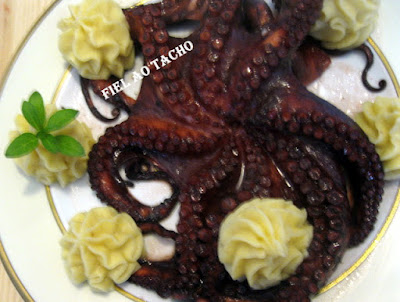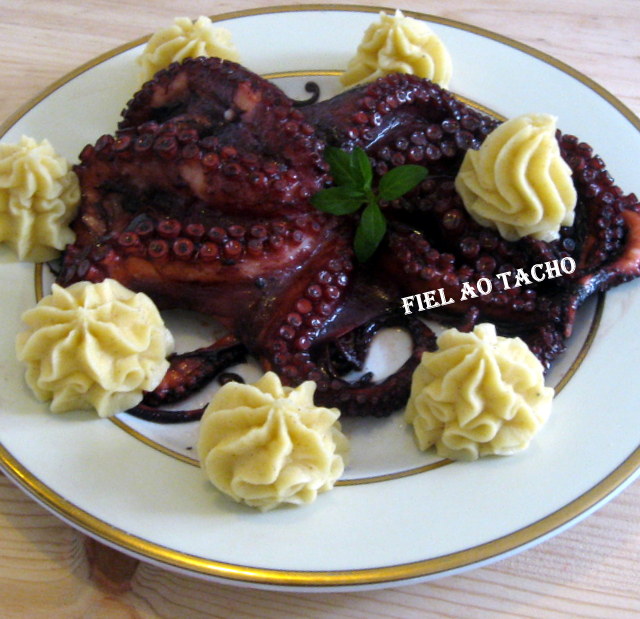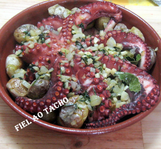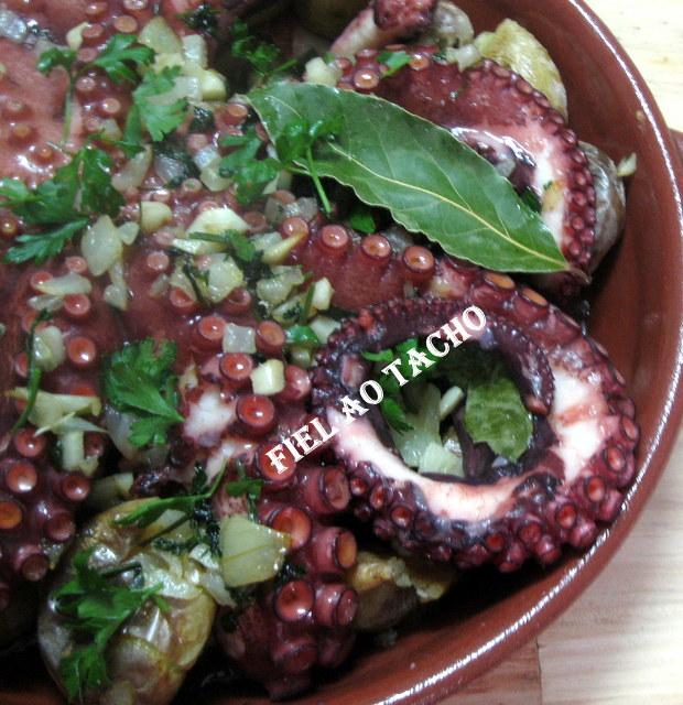 1. Coza o polvo na panela de pressão, durante 30 minutos em água juntamente com o louro, os dois dentes de alho, uma cebola, o vinho , o sal e a pimenta. Retire, 7 dl do caldo e corte o polvo aos pedaços.