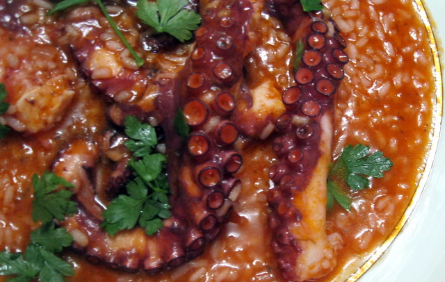 3. Envolva bem e adicione o arroz. Refogue um pouco. Junte o caldo reservado e deixe cozinhar durante 12 minutos, em lume brando. Acrescente o polvo e coentros e cozinhe por mais dois minutos. Por fim, rectifique os temperos. Sirva decorado com coentros.