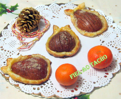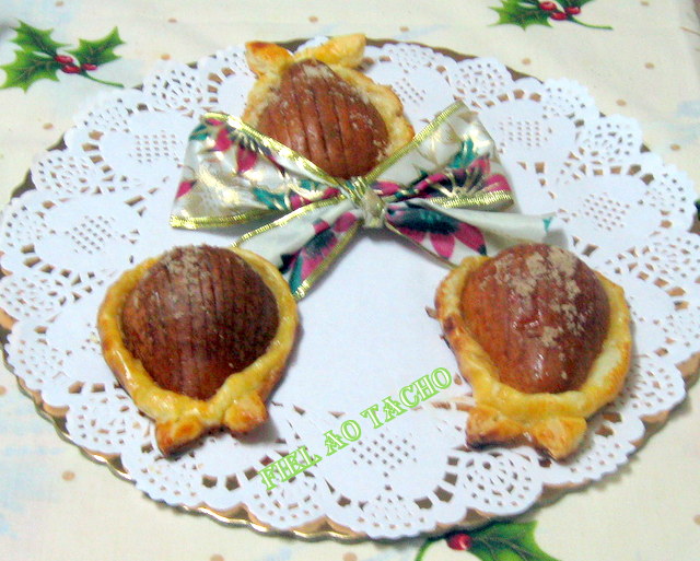 4 peras açúcar amarelo q. b. canela q. b. 2 embalagens de massa folhada 1 ovo